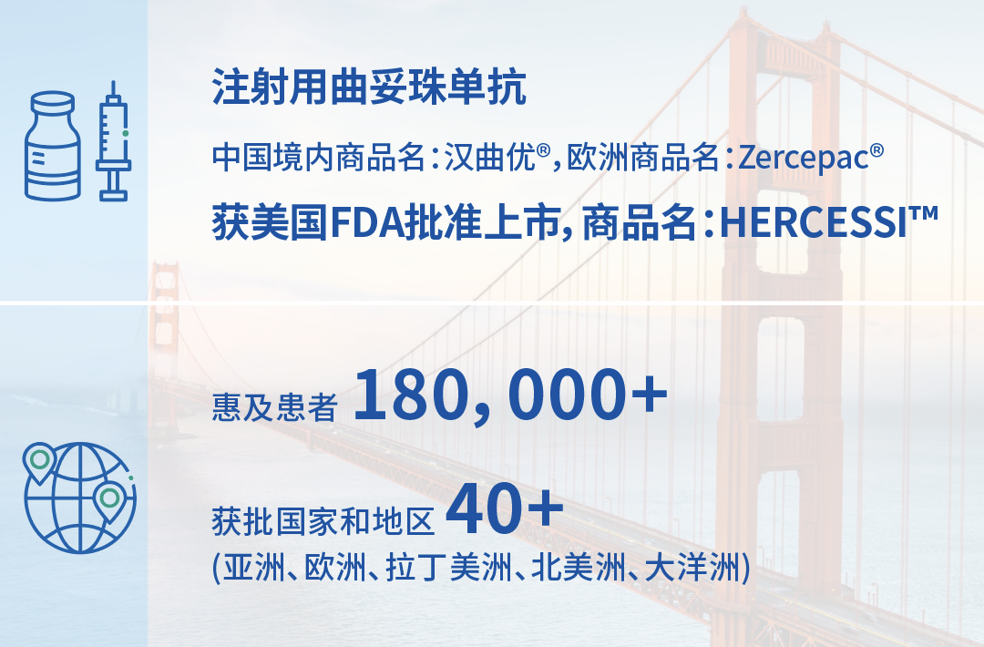博天堂官方网站医药自主研发的创新产品出海再有突破。2024年4月,注射用曲妥珠单抗(中国境内商品名:汉曲优)获美国FDA批准上市,用于辅助治疗HER2过表达乳腺癌、治疗HER2过表达转移性乳腺癌、以及治疗HER2过表达转移性胃腺癌或胃食管交界腺癌,成为首个在中国、欧盟、美国获批的国产生物类似药。截至目前,汉曲优现已在全球40余个国家和地区获批上市,惠及逾18万全球患者。